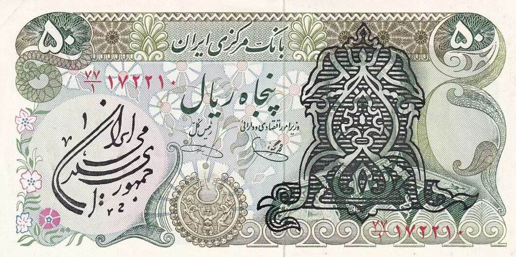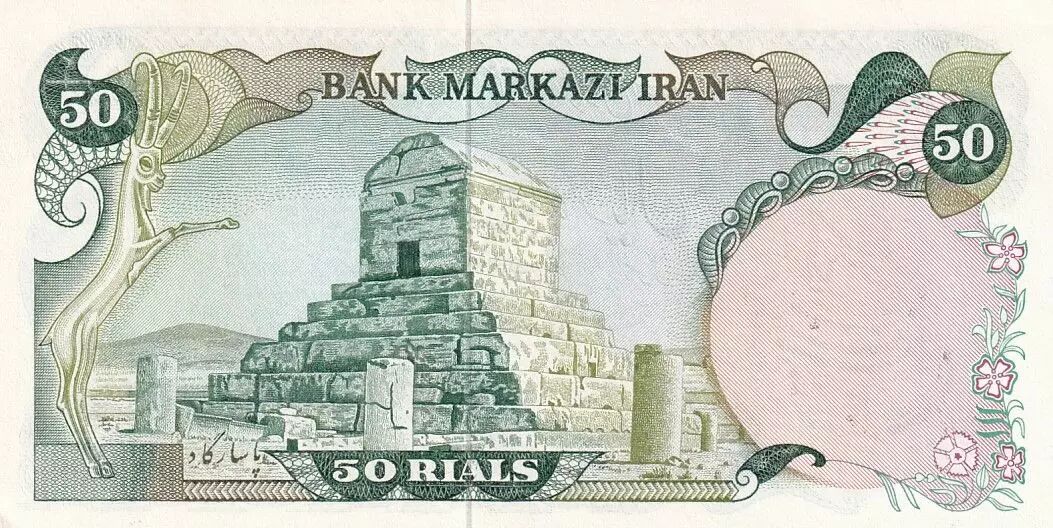 Billet Iran 50 Rials - Surimpression de motifs arabes sur Shah Palavi - Tombeau de Cyrus - 1974