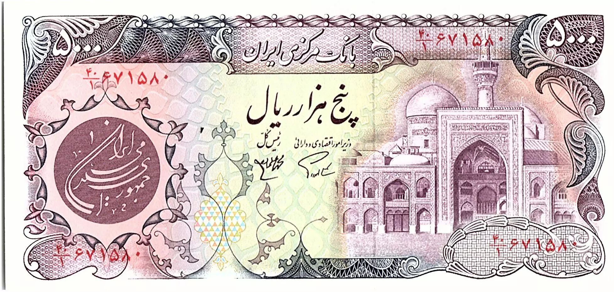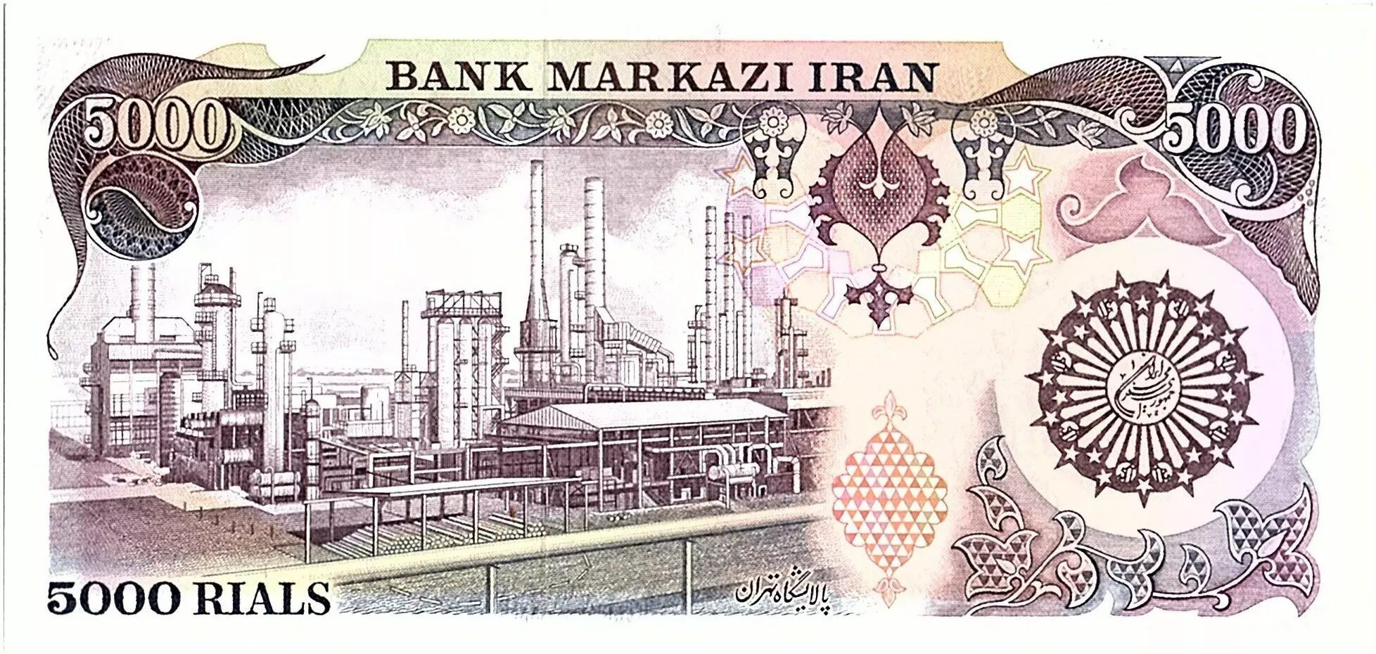 Banknote Iran 5000 Rials, Imam Reza Mosque - Oil refinery - 1981 - P.130 a
