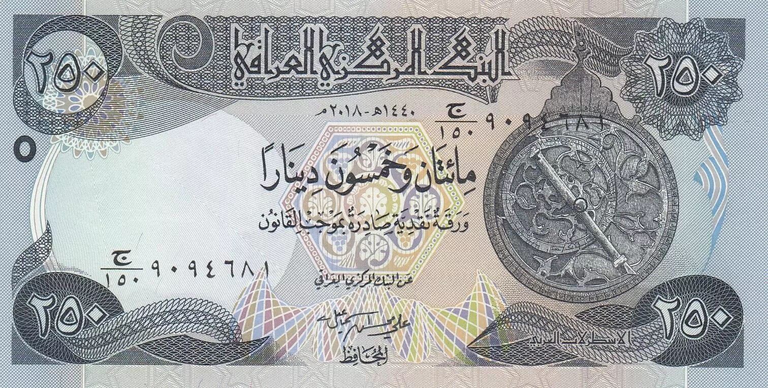 Banknote Iraq 250 Dinars Astrolab - Minaret of Samara - 2018 - UNC