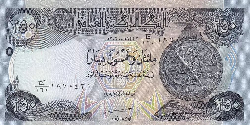 The 250 Iraqi Dinar banknote, issued in 2020, features a front side with light blue and dark blue as the dominant colors, applied on a multicolored background. A prominent visual element is the representation of an astrolabe, a historical astronomical instrument designed to model the universe in a portable manner, positioned on the right side of the banknote.