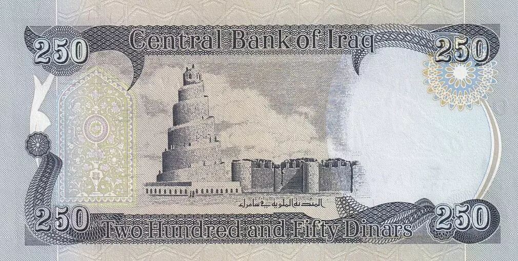 On the back, the banknote depicts the minaret of the Great Mosque of Samarra, a structure dating from the 9th century AD and located in Samarra, Iraq. This minaret is a significant architectural element of this historical site.