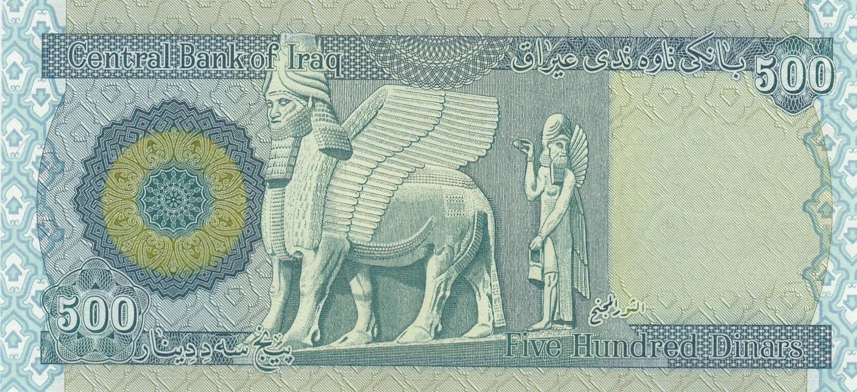 On the obverse, the main motif is a hydroelectric dam, a symbol of engineering and development in Iraq. The banknote also features a representation of the winged statue, an emblematic figure of Iraqi history and culture. The face value of 500 dinars is clearly indicated in Arabic numerals and Arabic letters. Geometric and floral decorative elements also adorn this side, adding an aesthetic dimension to the design. The official signatures of the competent monetary authorities are also present.