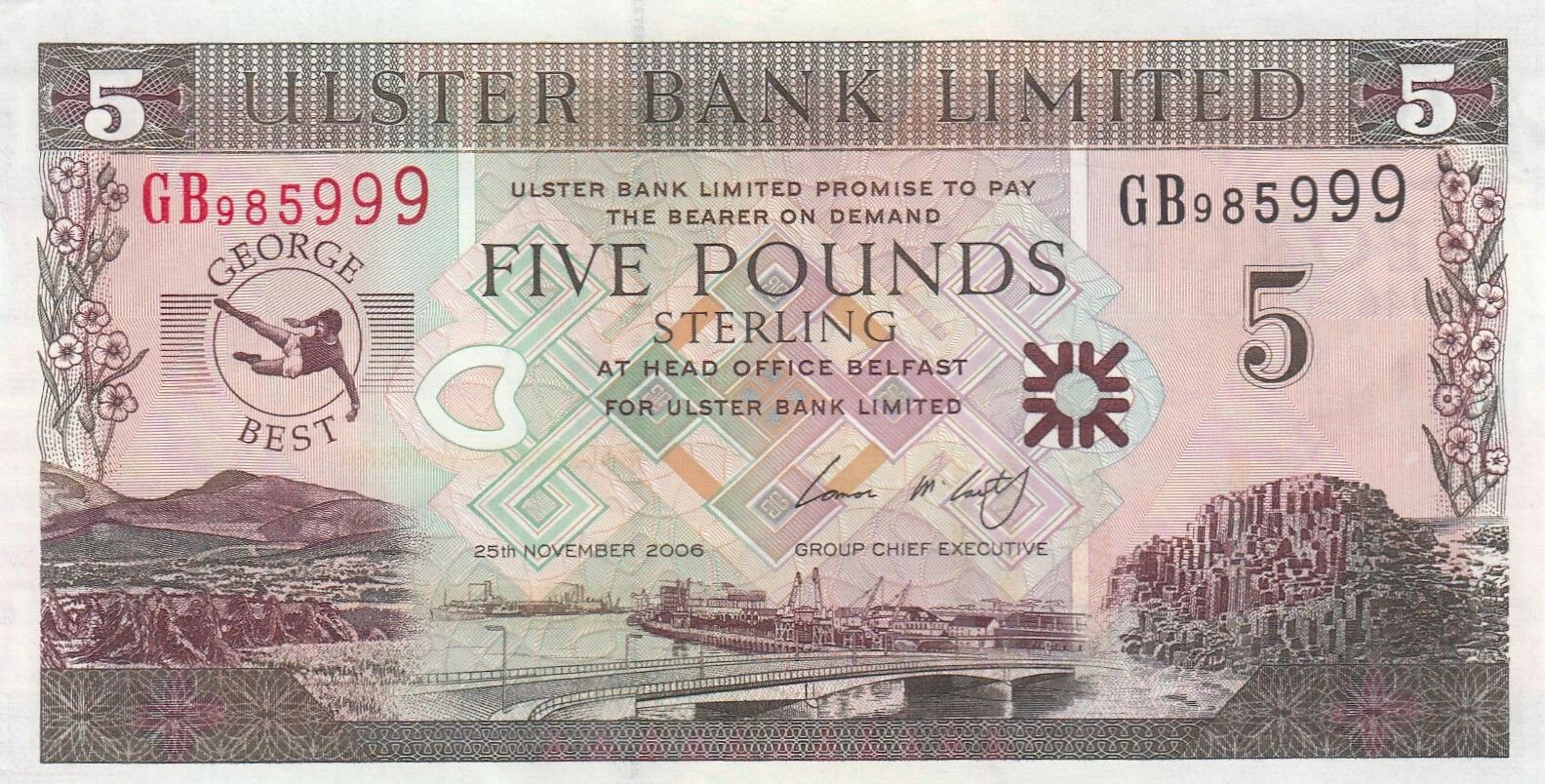 This banknote is a 5 pound sterling note issued by Ulster Bank in 2006, part of the GB series. It commemorates George Best, an iconic figure. The note originates from Northern Ireland and weighs 1 unit of weight (the unit is not specified).