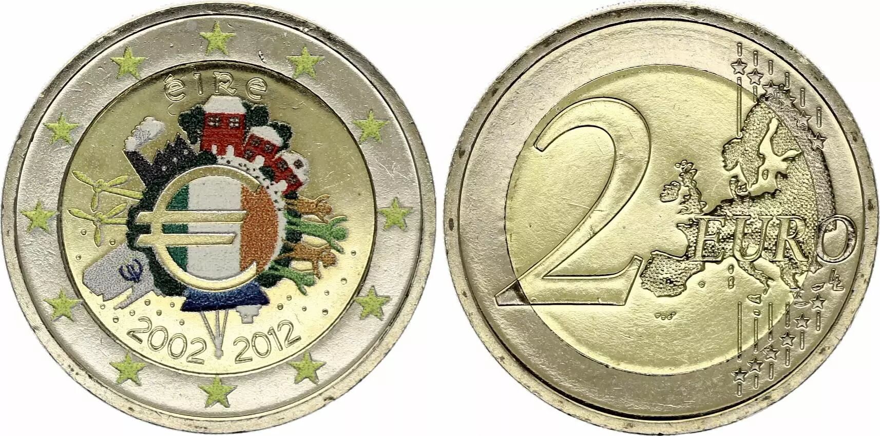 Pièce Irlande 2 Euros - 10 ans de l'Euro - Colorisée - 2012