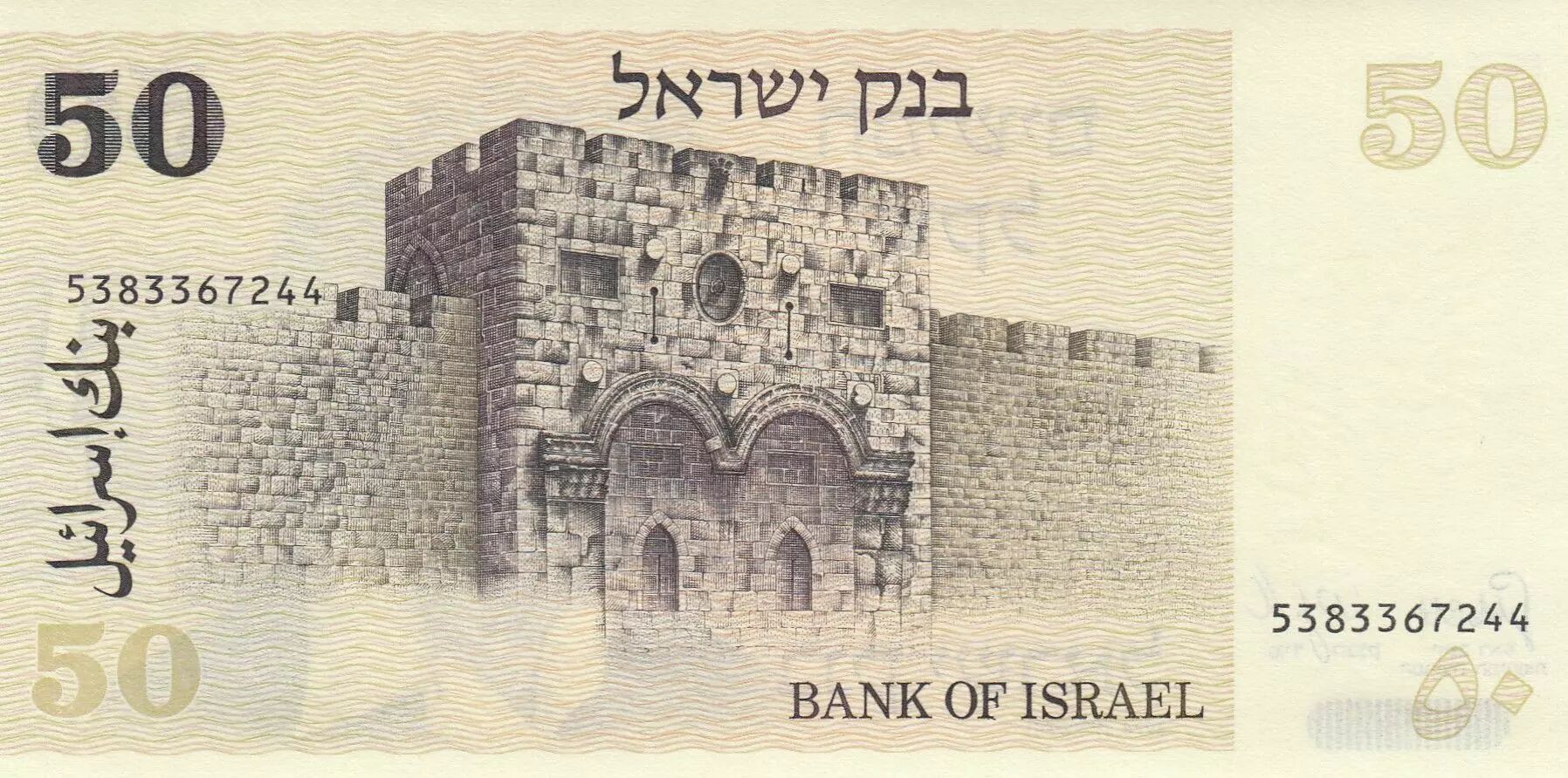 The back of the note depicts the Golden Gate, located in the Old City of Jerusalem. This gate has significant historical and religious importance. The name of the "Bank of Israel" is indicated in three languages: Hebrew, English, and Arabic.
