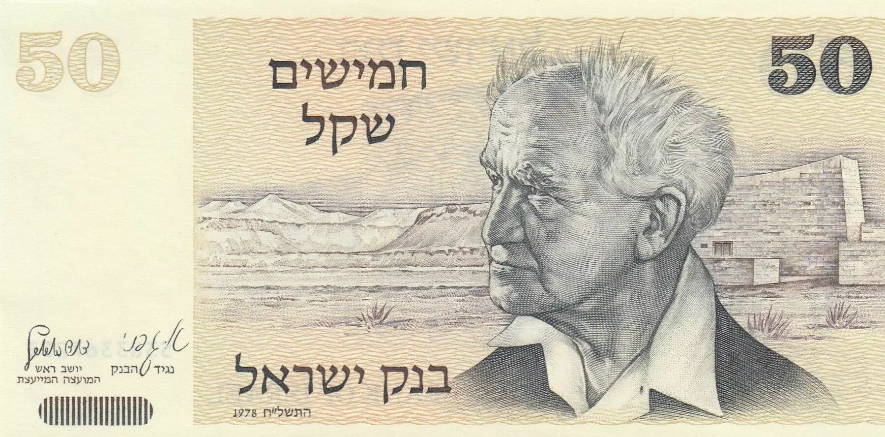 Ce billet de banque, d'une valeur nominale de 50 sheqalim, a été émis en Israël en 1978. Il commémore David Ben-Gourion, figure marquante de l'histoire israélienne.