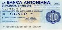 Accueil > Billets du Monde > Chèques et travellers Chèques > Italie 100 Lire Banca Antonina di Padova i Trieste - 1976 - Padova - NEUF