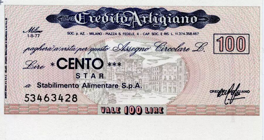 Accueil > Billets du Monde > Chèques et travellers Chèques > Italie 100 Lire Credito Artigiano - 1977 - Milano - NEUF