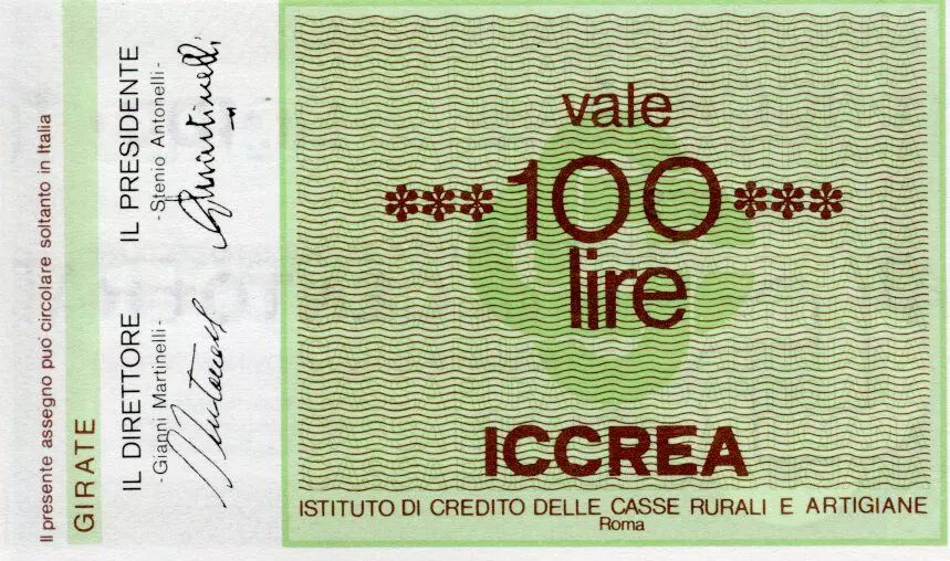 Accueil > Billets du Monde > Chèques et travellers Chèques > Italie 100 Lire ICCREA - 1977 - Roma - a Confesercenti della Provincia di Forli - NEUF