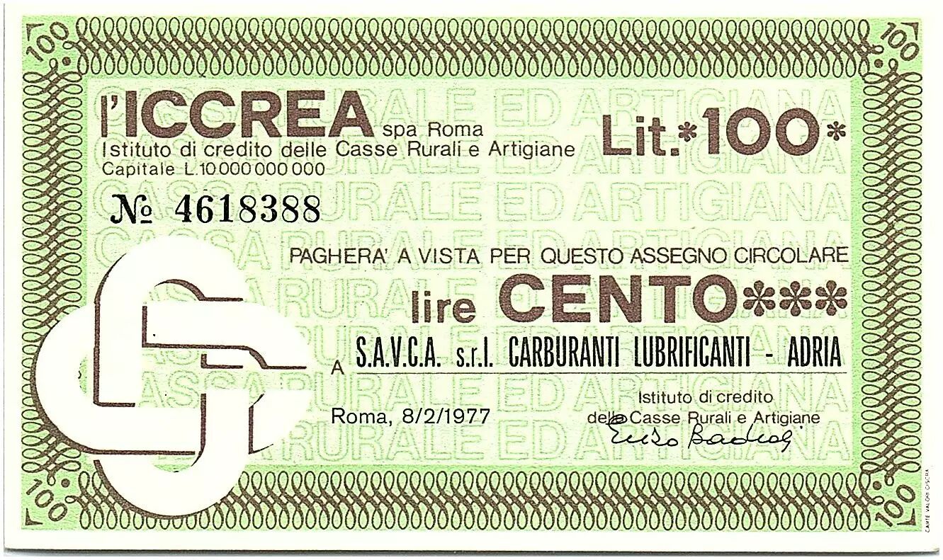 Accueil > Billets du Monde > Chèques et travellers Chèques > Italie 100 Lire ICCREA - SAVCA - Carburanti - 1977 - Neuf