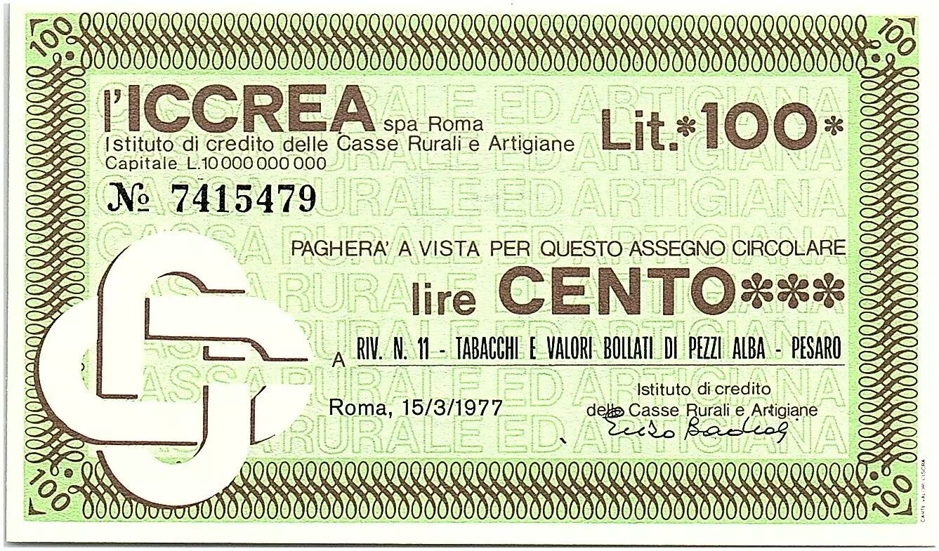 Accueil > Billets du Monde > Chèques et travellers Chèques > Italie 100 Lire ICCREA - Tabbacchi Bollati - 1977 - Neuf