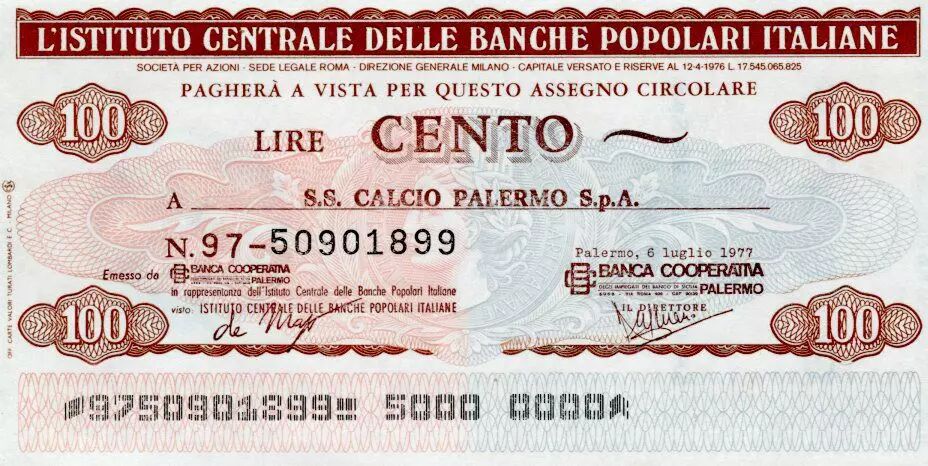 Accueil > Billets du Monde > Chèques et travellers Chèques > Italie 100 Lire Istituto Centrale Delle Banche Popolari Italiane - 1977 - Palermo - NEUF