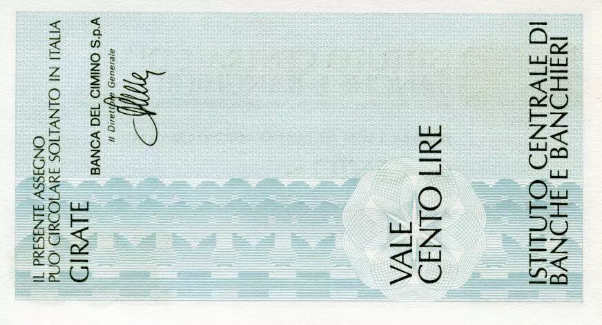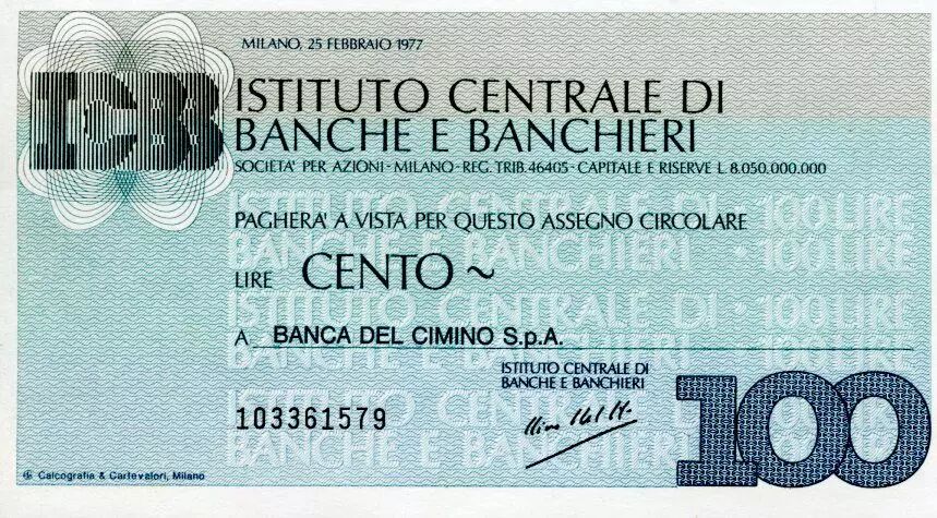 Accueil > Billets du Monde > Chèques et travellers Chèques > Italie 100 Lire Istituto Centrale di Banche E Banchieri - 1977 - Milano - a Banca Del Cimino - NEUF