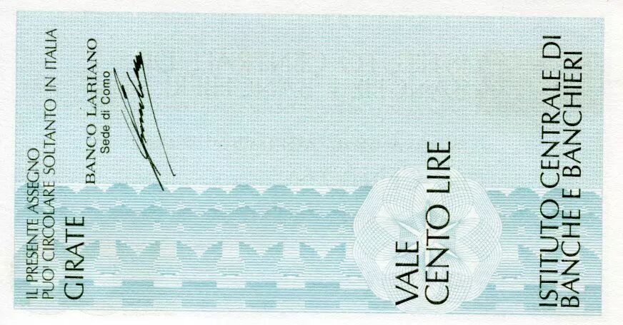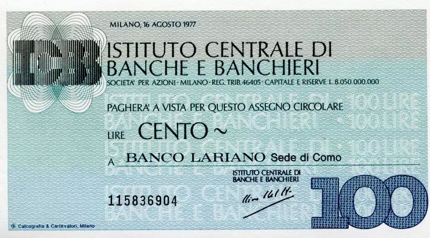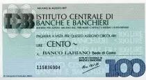 Accueil > Billets du Monde > Chèques et travellers Chèques > Italie 100 Lire Istituto Centrale di Banche E Banchieri - 1977 - Milano - a Banco Lariano - NEUF