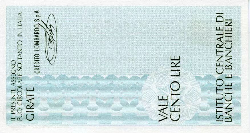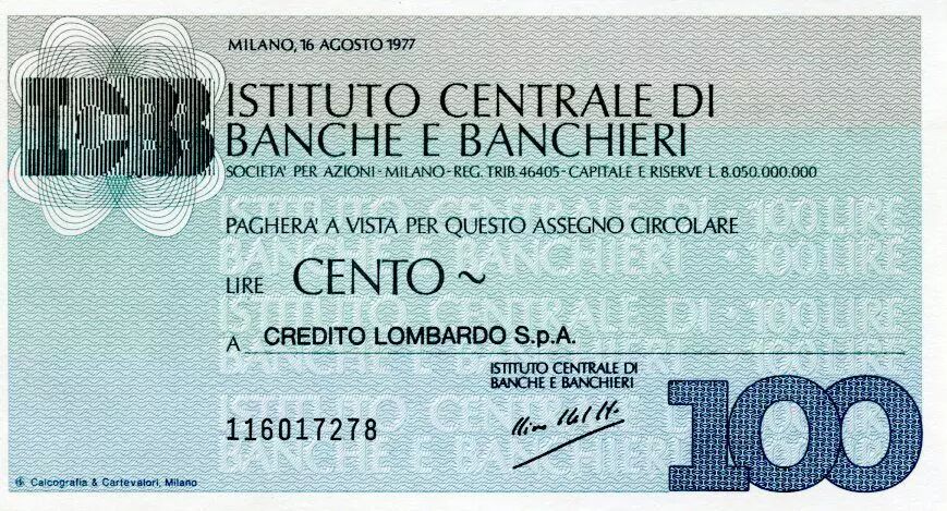 Accueil > Billets du Monde > Chèques et travellers Chèques > Italie 100 Lire Istituto Centrale di Banche E Banchieri - 1977 - Milano - a Credito Lombardo - NEUF