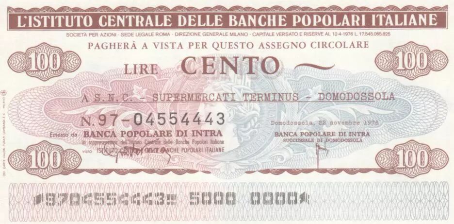 Accueil > Billets du Monde > Chèques et travellers Chèques > Italie 100 Lire Istituto Generale delle Banche Popolari Italiane - 1976 - Neuf - Domodossola