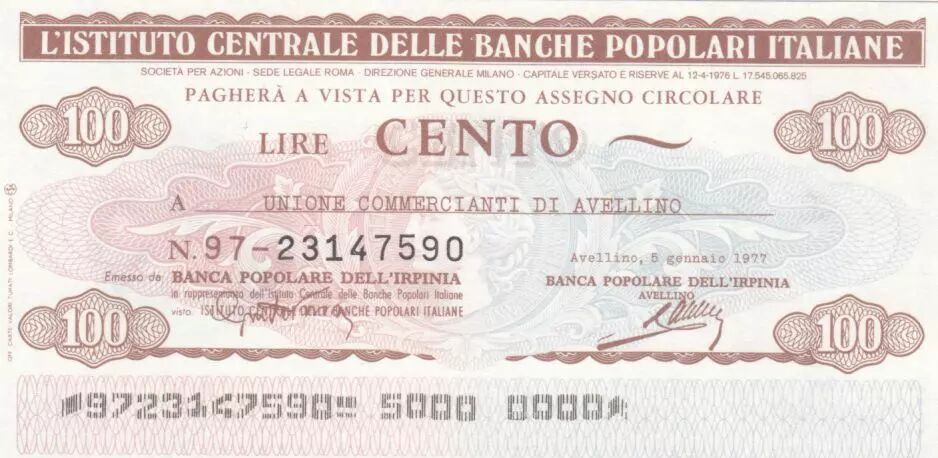 Accueil > Billets du Monde > Chèques et travellers Chèques > Italie 100 Lire Istituto Generale delle Banche Popolari Italiane - 1977 - Neuf - Avelino