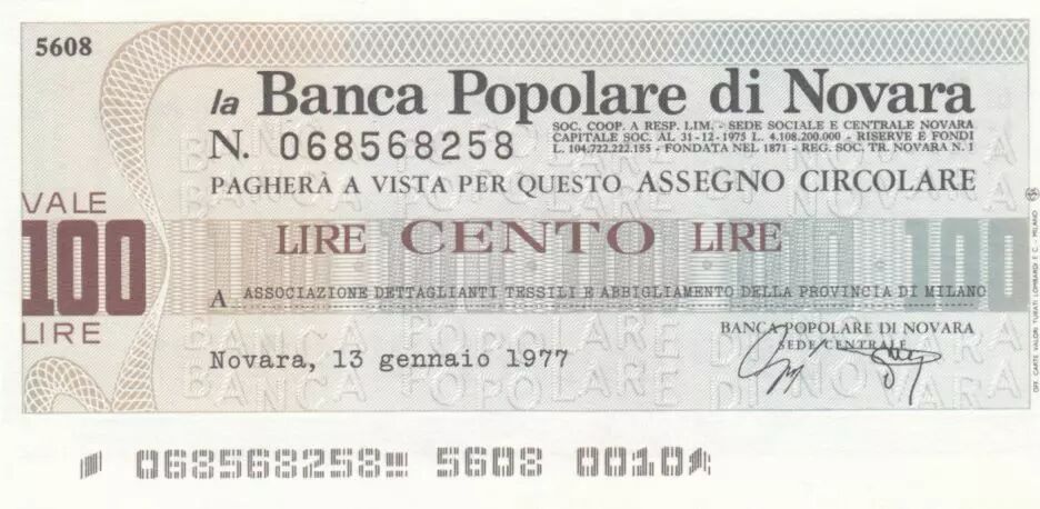 Billet Italie 100 Lires Banca Popolare di Novara - 13-01-1977 - Neuf