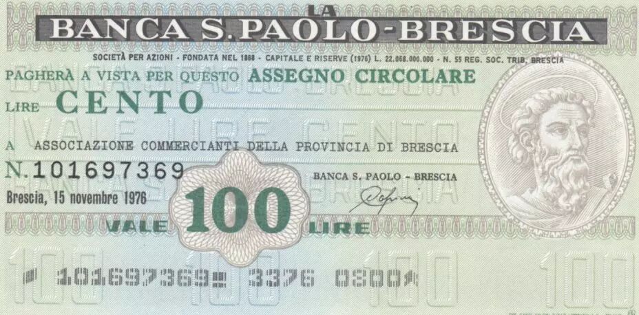 Accueil > Billets du Monde > Chèques et travellers Chèques > Italie 100 Lires Banca S.Paolo-Brescia - 1976 - Neuf