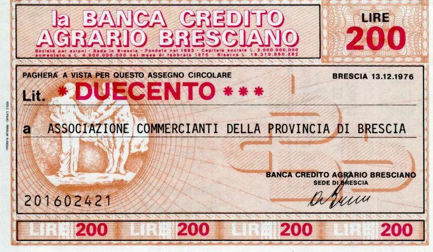 Billet Italie 200 Lire Banca Credito Agrario Bresciano - 1976 - Brescia - Neuf
