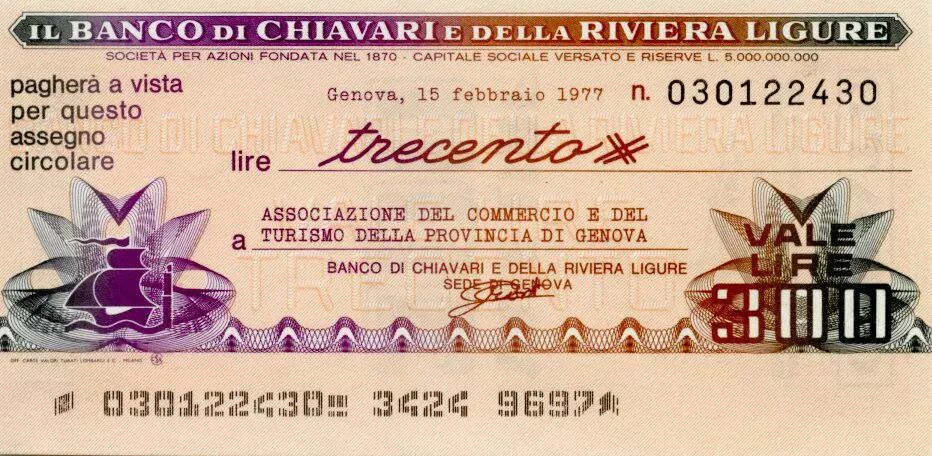 Accueil > Billets du Monde > Chèques et travellers Chèques > Italie 300 Lire Banco di Chiavari e della Riviera Ligure - 1977 - Genova - Neuf