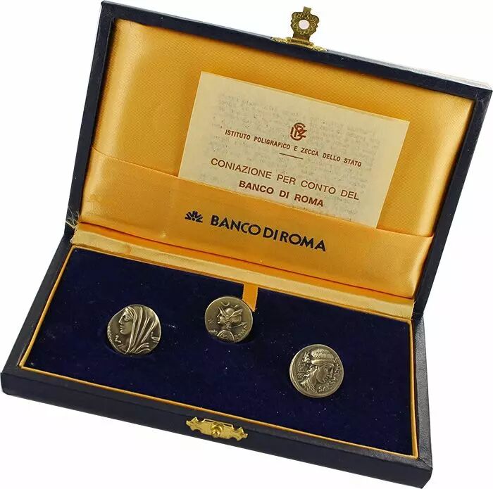 Coffret incluant 3 médailles en argent - reproduction modernes - émises en 1988 par la Banco di Roma.