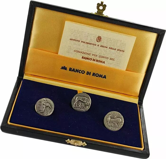 Coffret incluant 3 médailles en argent - reproduction modernes - émises en 1984 par la Banco di Roma.