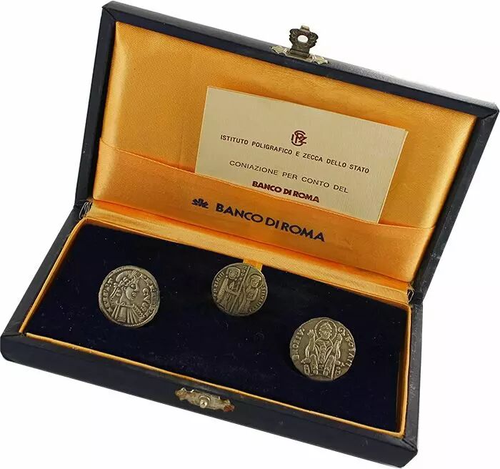 Coffret incluant 3 médailles en argent - reproduction modernes - émises en 1990 par la Banco di Roma.