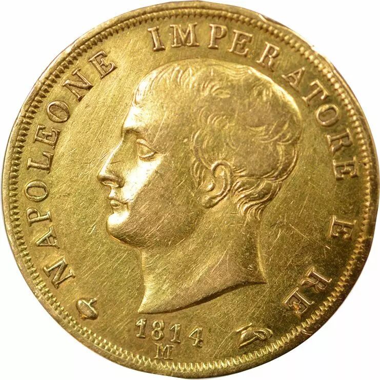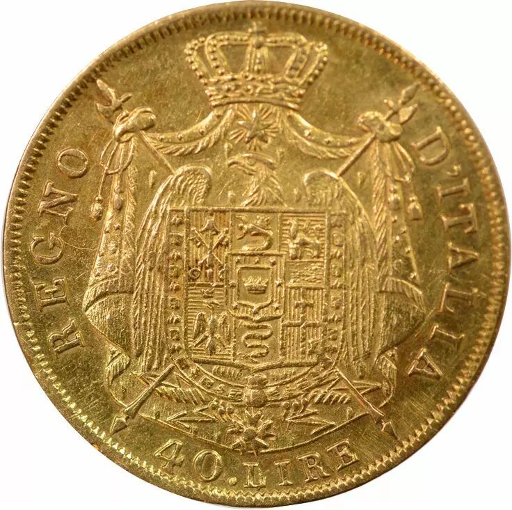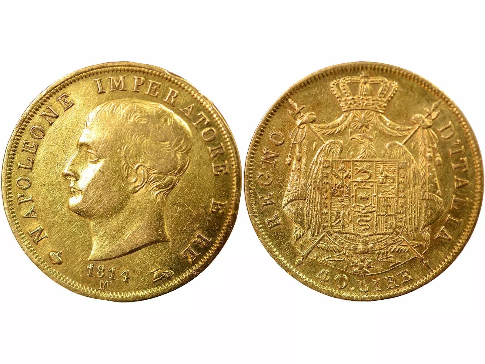 La pièce de monnaie est une 40 Lire Or, frappée en 1814 à Milan. La pièce est associée à Napoléon Ier, qui portait les titres d'Empereur des Français et de Roi d'Italie à l'époque de sa production.La pièce est composée d'or. Son poids est de 12.85 grammes et son diamètre mesure 26 millimètres.