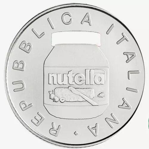 A l'occasion des 75 ans du groupe Ferrero l'Istituto Poligrafico dello Stato (IPZS) l'Hôtel des Monnaies italien a émis trois versions d'une pièce consacrée au produit phare du groupe agroalimentaire la Nutella. Fondée au sortir de la guerre par Pietro Ferrero à Alba dans le Piémont Ferrero produit d'abord une sorte de pâte dur à base de noisette et d'un peu de chocolat. En effet à l'époque le chocolat est rare et les noisettes sont produites par les paysans aux alentours. La légende dit que lors de l'été caniculaire de1949 Michele fils de Pietro s'est mis à vendre ce produit qui ne supportait pas la chaleur devenant mou. Pour cela il le conditionna dans de petits pots de verre. Devant le succès la recette est adaptée avec l'intégration de beurre de cacao afin que la texture ne durcisse pas. S'appelant "Gianduja" puis "Supercrema" la pâte prend le nom de "Nutella" en 1964 lors du développement des ventes à l'international.