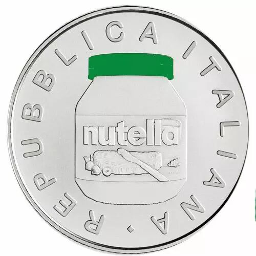 A l'occasion des 75 ans du groupe Ferrero l'Istituto Poligrafico dello Stato (IPZS) l'Hôtel des Monnaies italien a émis trois versions d'une pièce consacrée au produit phare du groupe agroalimentaire la Nutella. Fondée au sortir de la guerre par Pietro Ferrero à Alba dans le Piémont Ferrero produit d'abord une sorte de pâte dur à base de noisette et d'un peu de chocolat. En effet à l'époque le chocolat est rare et les noisettes sont produites par les paysans aux alentours. La légende dit que lors de l'été caniculaire de1949 Michele fils de Pietro s'est mis à vendre ce produit qui ne supportait pas la chaleur devenant mou. Pour cela il le conditionna dans de petits pots de verre. Devant le succès la recette est adaptée avec l'intégration de beurre de cacao afin que la texture ne durcisse pas. S'appelant "Gianduja" puis "Supercrema" la pâte prend le nom de "Nutella" en 1964 lors du développement des ventes à l'international.