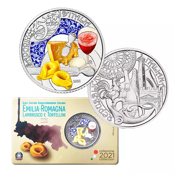 Accueil > Archivage > archivage-Archivage > Italie Tortellini et Lambrusco - Emilie Romagne - 5 Euros Argent Couleur ITALIE 2021 - Excellence italienne