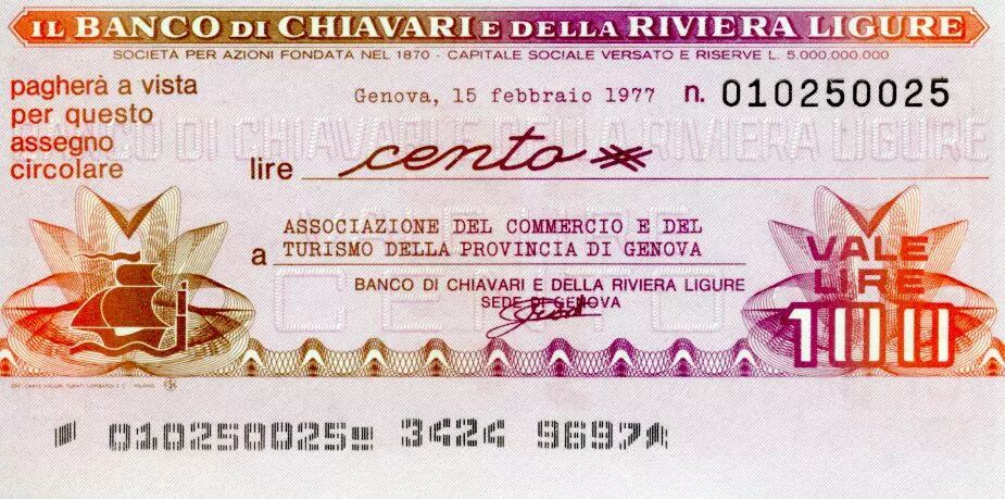 Home > World Banknotes > Checks and Traveler's Checks > Italy 100 Lire Banco di Chiavari e della Riviera Ligure - 1977 - Genova - UNC