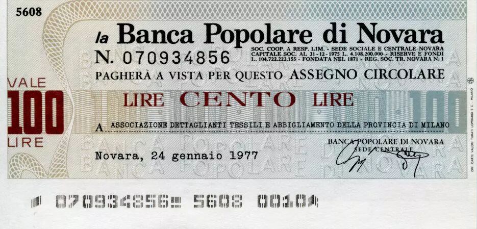 Home > World Banknotes > Checks and Traveler's Checks > Italy 100 Lire Banco Popolare di Novara - 1977 - Novara - UNC