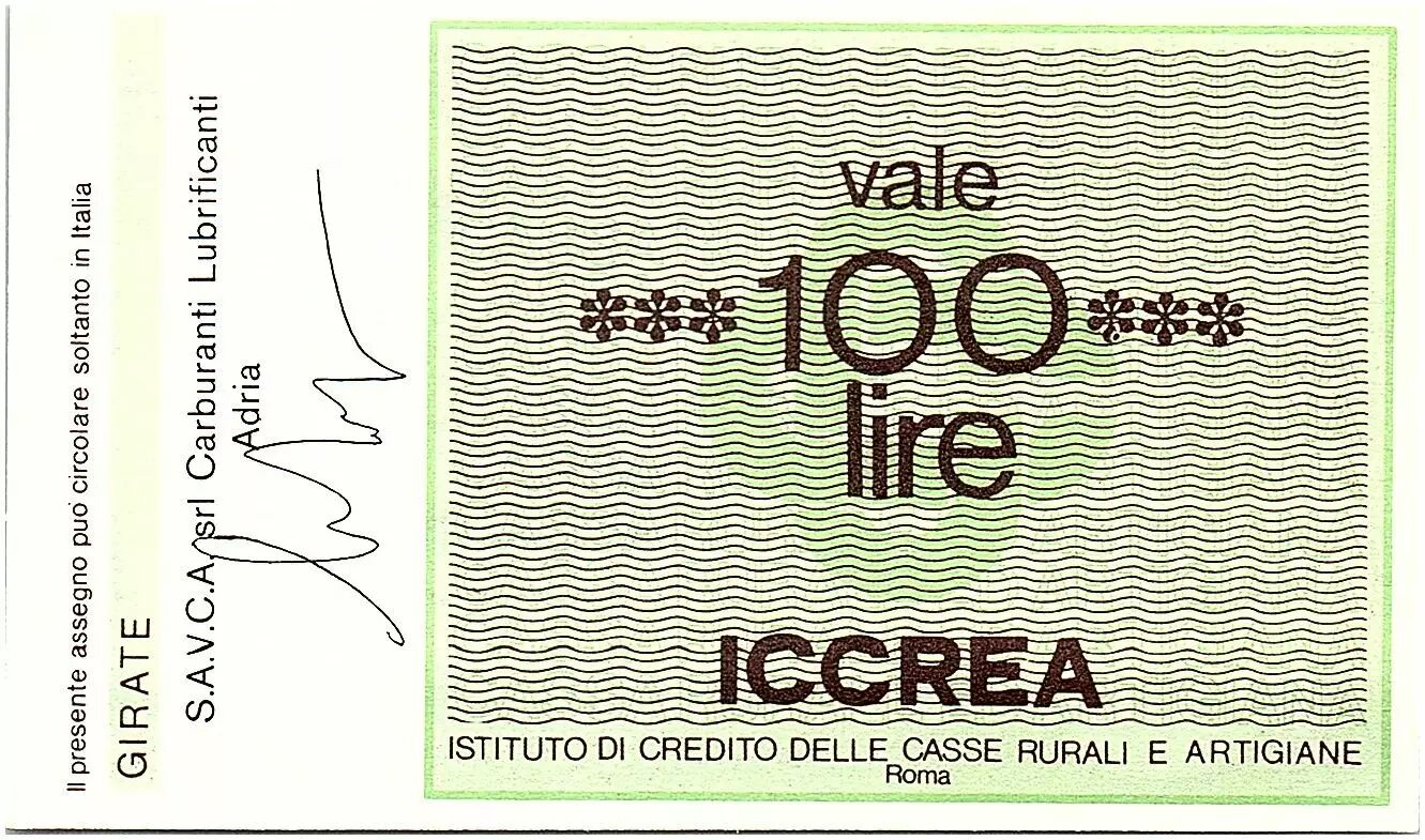 Home > World Banknotes > Checks and Traveler's Checks > Italy 100 Lire ICCREA - SAVCA - Carburanti - 1977 - UNC