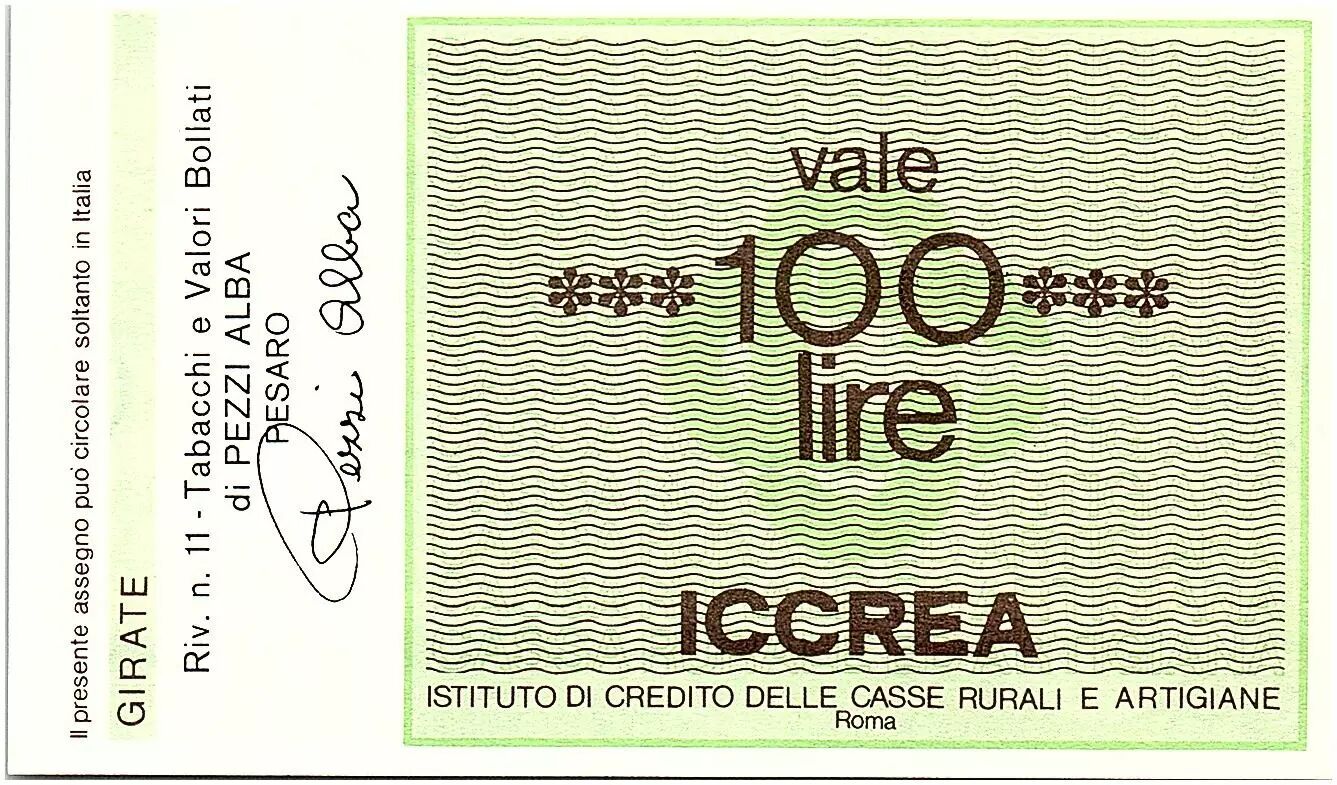 Home > World Banknotes > Checks and Traveler's Checks > Italy 100 Lire ICCREA - Tabbacchi Bollati - 1977 - UNC