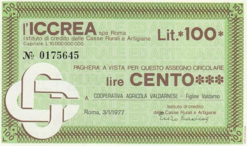 Home > World Banknotes > Checks and Traveler's Checks > Italy 100 Lire ICCREA - Valdarno - 1977 - UNC