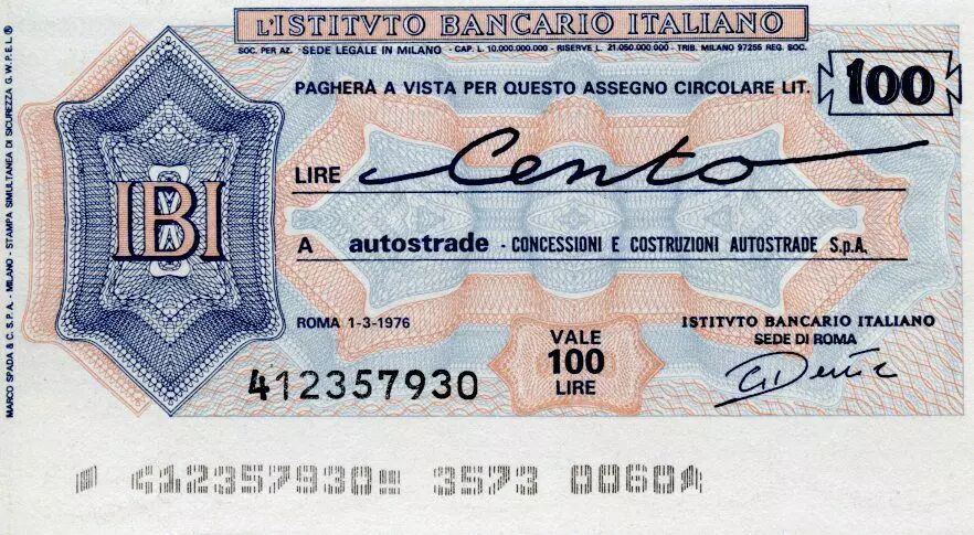 Home > World Banknotes > Checks and Traveler's Checks > Italy 100 Lire Istituto Bancario Italiano - 1976 - Roma - UNC