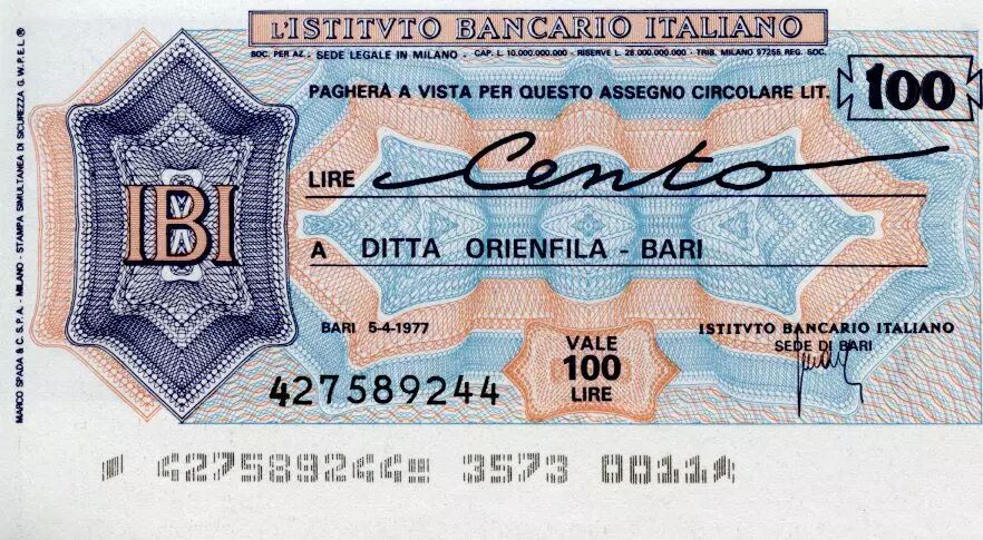 Home > World Banknotes > Checks and Traveler's Checks > Italy 100 Lire Istituto Bancario Italiano - 1977 - Bari - UNC