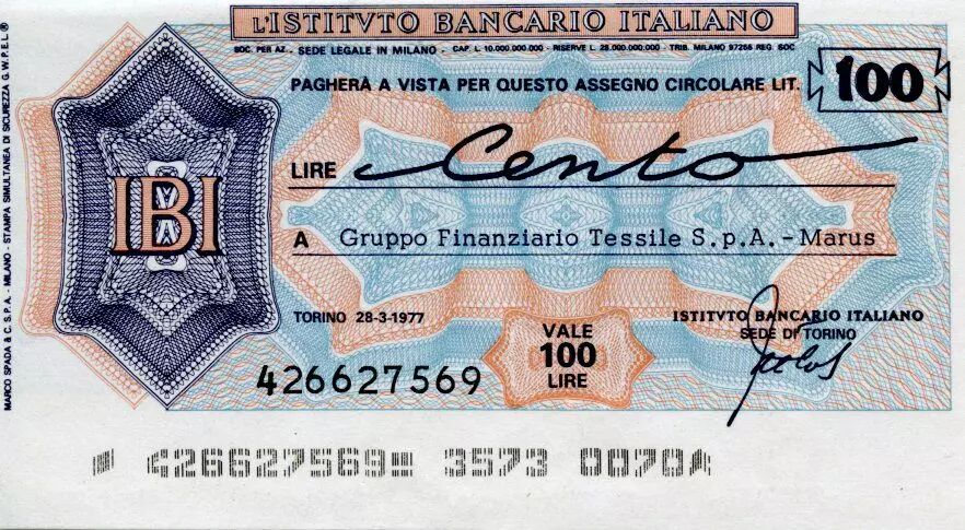 Home > World Banknotes > Checks and Traveler's Checks > Italy 100 Lire Istituto Bancario Italiano - 1977 - Torino - UNC