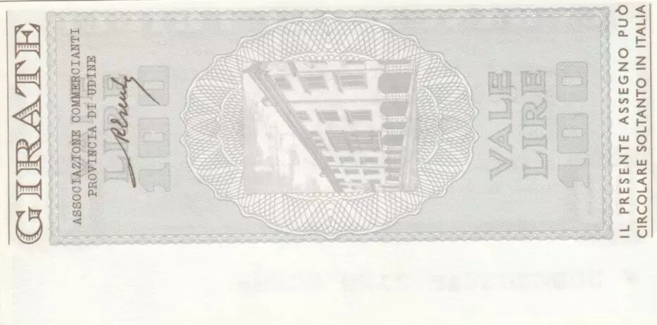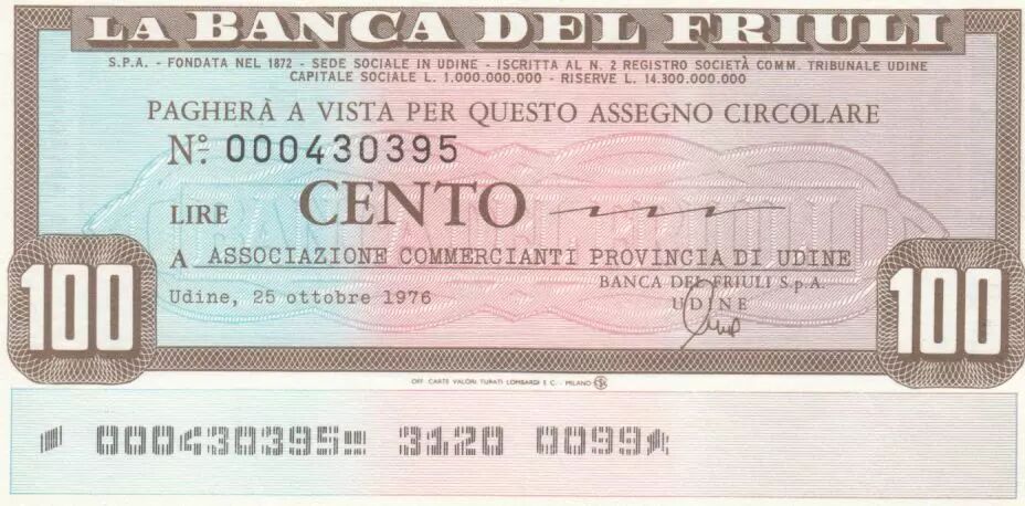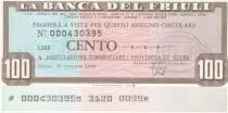 Home > World Banknotes > Checks and Traveler's Checks > Italy 100 Lires Banca del Friuli - 25-10-1976 - UNC