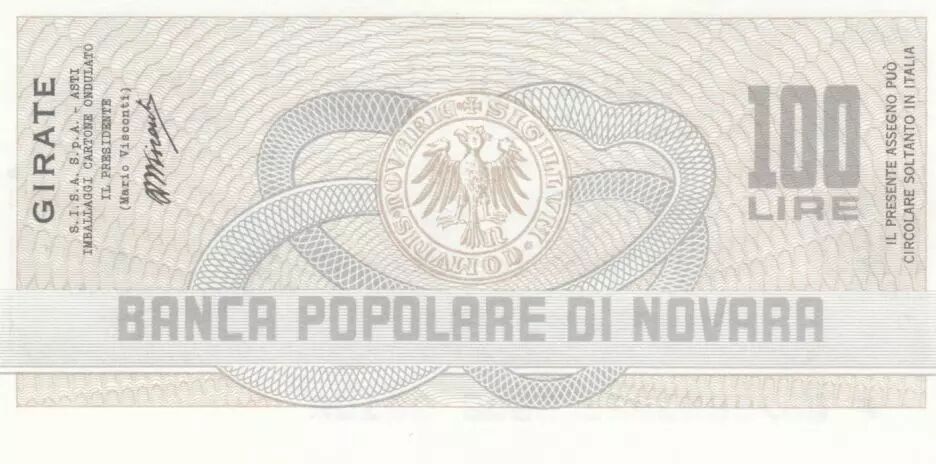 Home > World Banknotes > Checks and Traveler's Checks > Italy 100 Lires Banca Popolare di Novara - 17-01-1977 - UNC