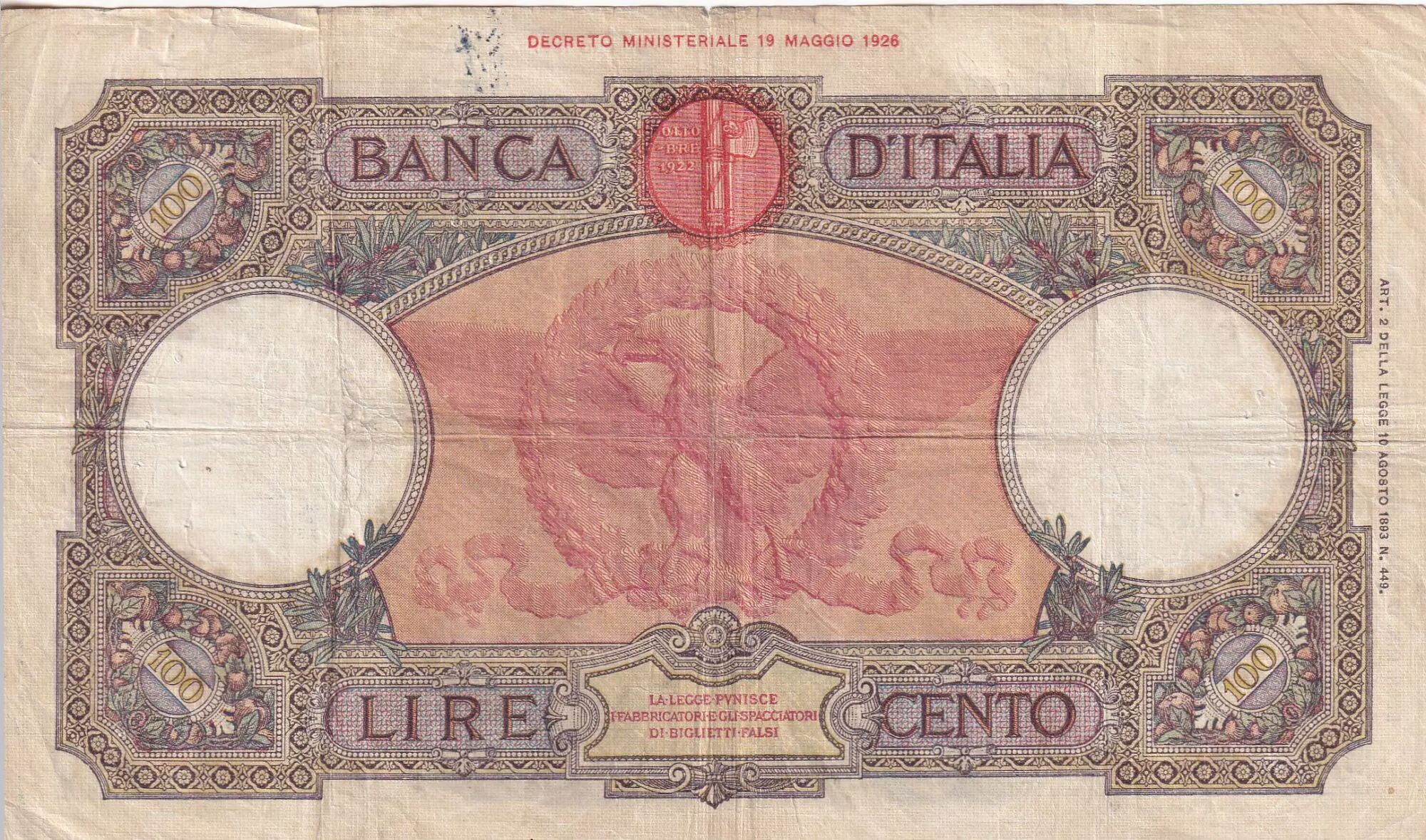 Home > > Italy 100 Lires - Wolf - Eagle - 05-10-1931 - Serial D.150 - P.55a
