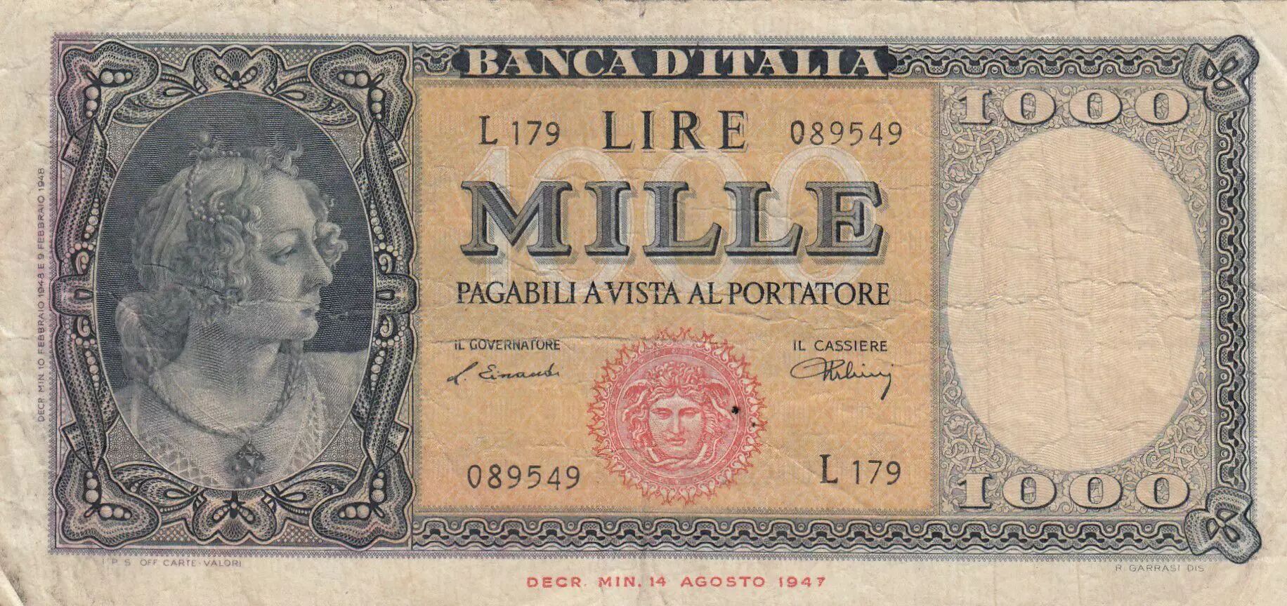 Banknote Italy 1000 Lire Italia - 1948 - F to VF - Serial L.179 - P.88a