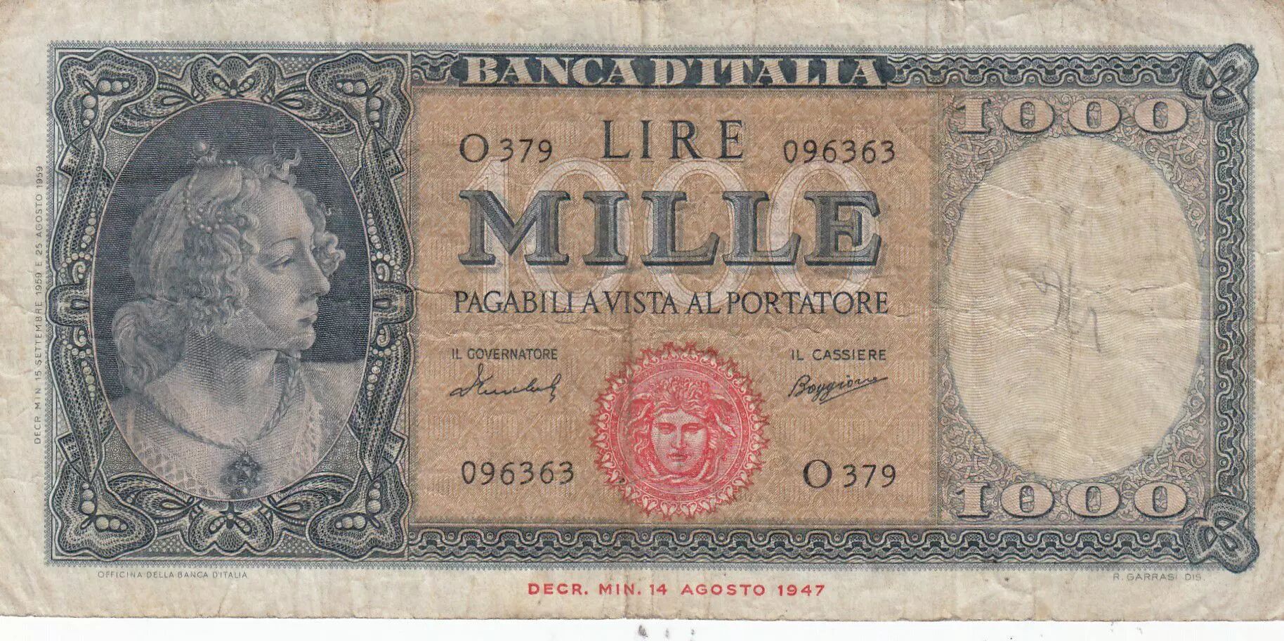Home > World Banknotes > European Banknotes > Italy - Italian States > Italy > Italy 1000 Lire Italia - 1959 - VF - Serial O.379 - P.88c