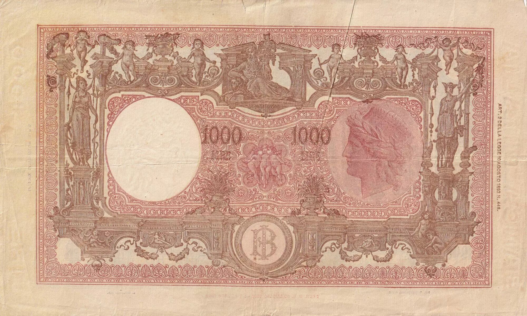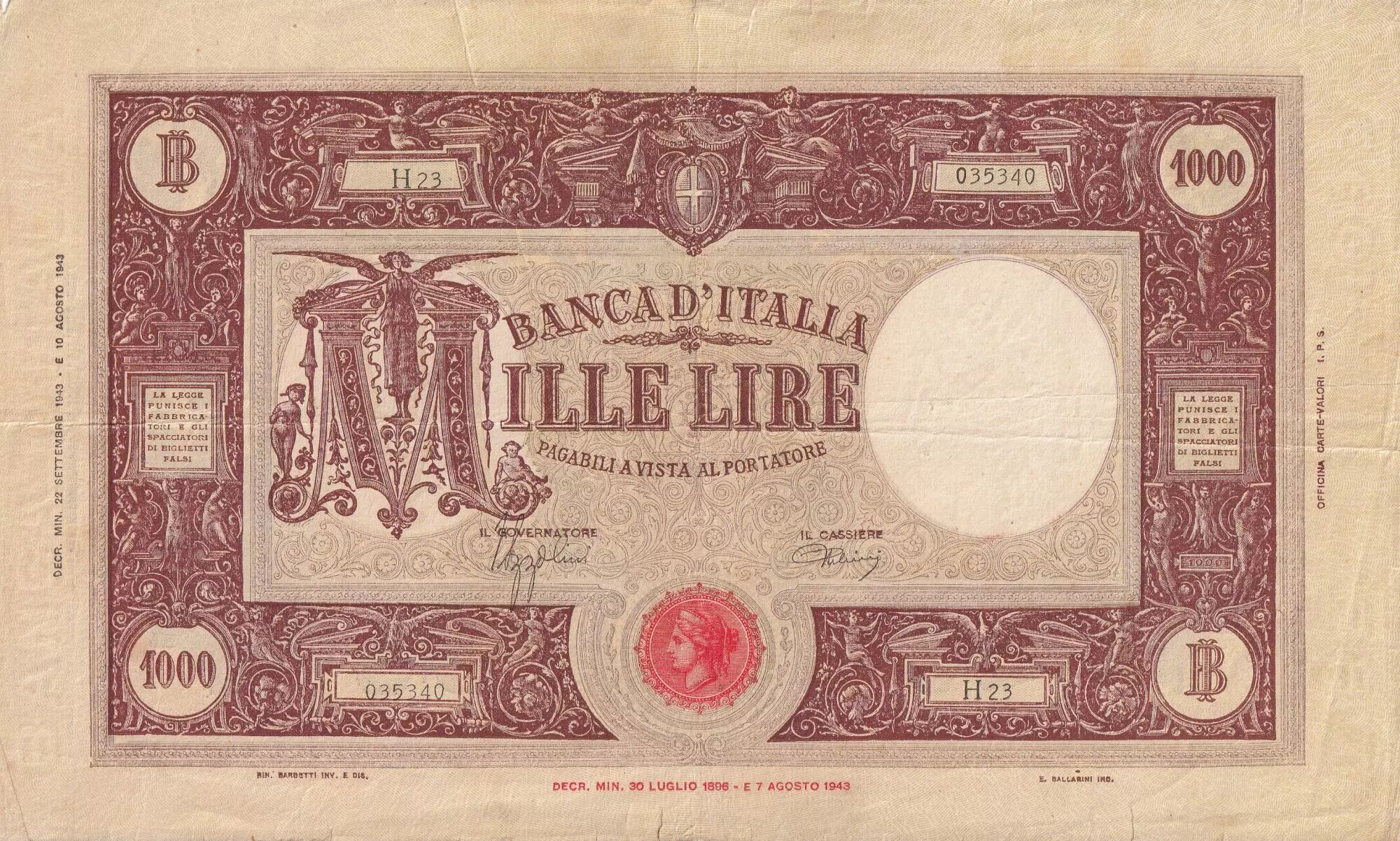 Banknote Italy 1000 Lire - Ornate border - 1943 - Serial H 23 - F - P.72a
