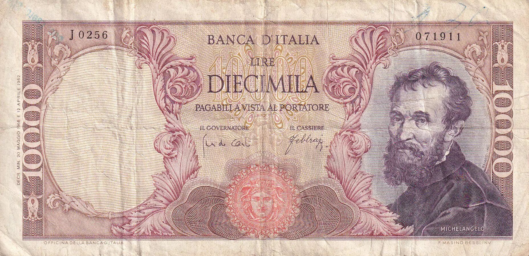 Banknote Italy 10000 Lire - Michelangelo - 20-05-1966 - Serial J - P.97c