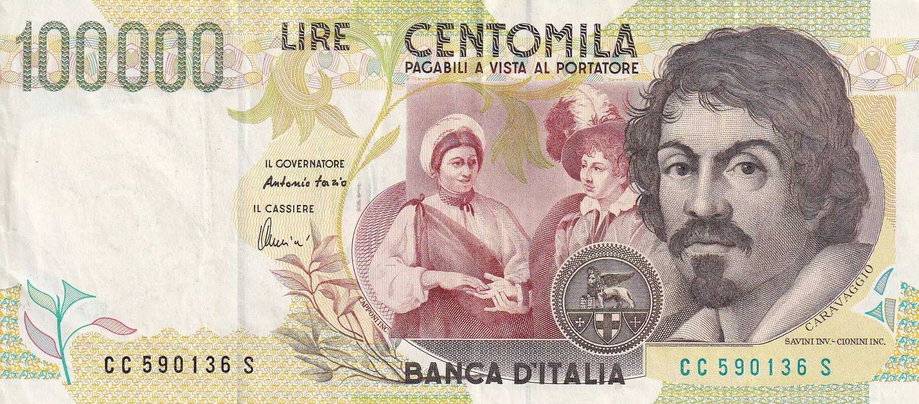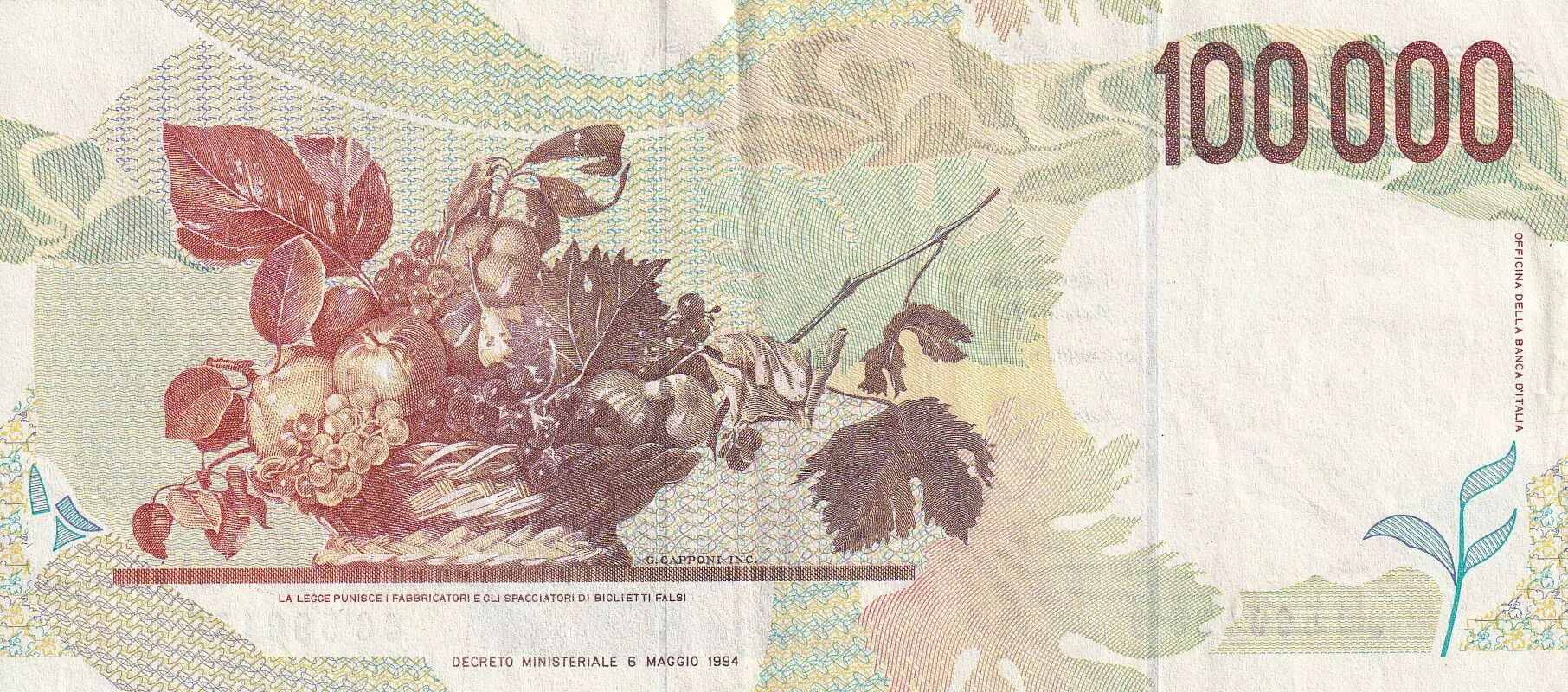 Banknote Italy 100000 Lire - Caravaggio - Fruits - 1994 - VF to XF - P.117b