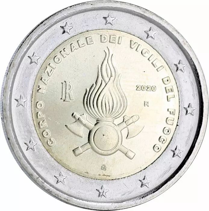 To mark the 80th anniversary of the Italian Fire Brigade, the IPZS is issuing a coin in honor of the fire department. In the center, the Italian fire department logo. On the left, "RI", an acronym for Italian Republic; on the right, the year "2020"; followed by an "R", different from that of the Mint of Rome; below, "LDS", the initials of artist Luciana De Simoni; in the circle, the inscription "CORPO NAZIONALE DEI VIGILI DEL FUOCO" and the twelve stars of the European Union.