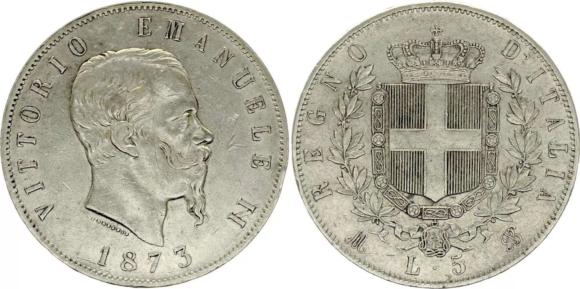 Coin Italy 5 Lire, Victor Emmanuel II - Arms - 1873 M BN